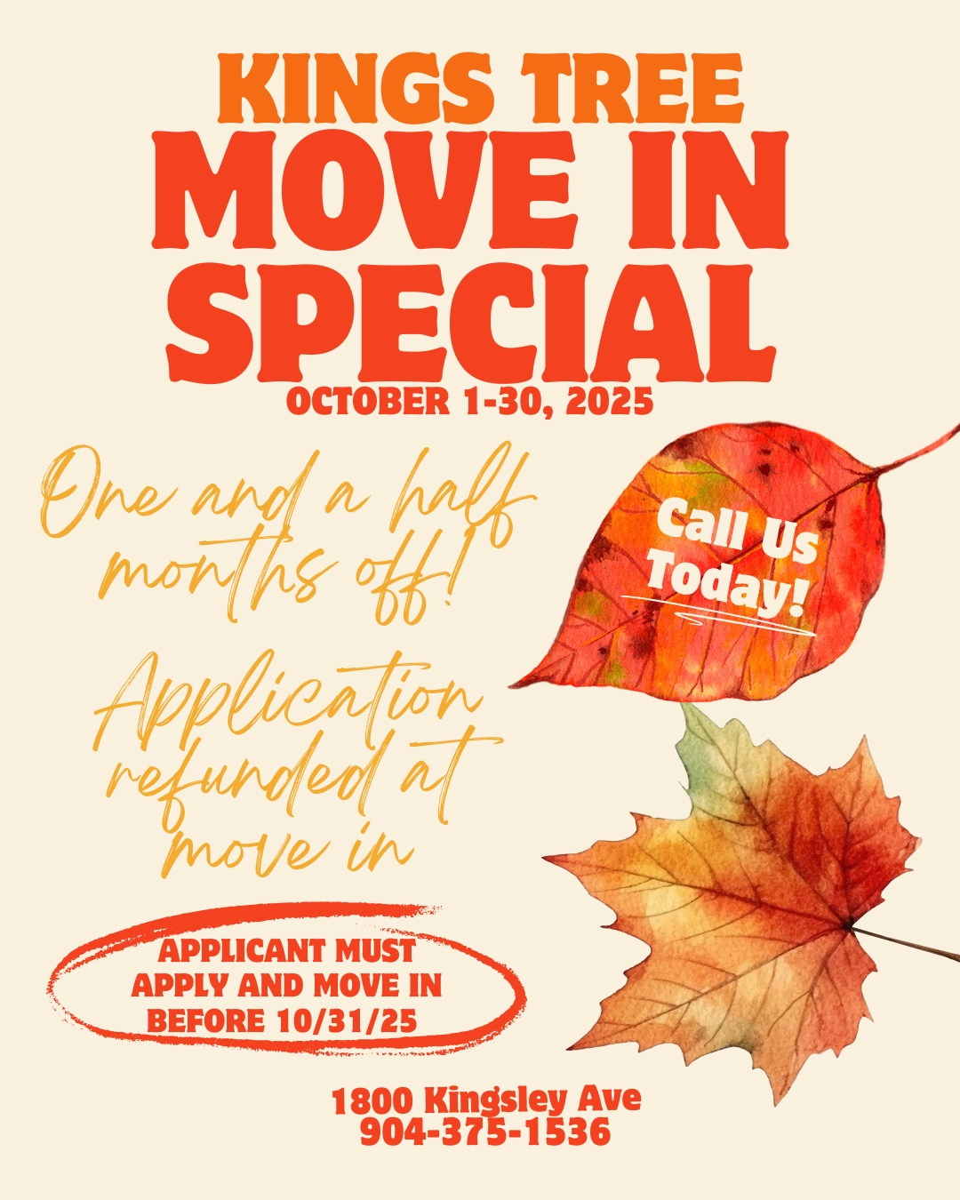 Discover the charm of Kings Tree Apartments in Orange Park, Florida, where modern living meets peaceful surroundings. Our community is conveniently located near NAS Jacksonville in a quiet residential neighborhood. Enjoy easy access to vibrant shopping, dining, and exciting entertainment options just minutes away.